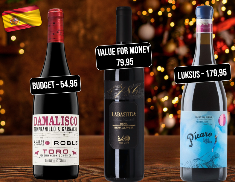 De fleste har en meget god idé om, hvad de vil betale for deres julevin og derfor inddeler jeg mine vinanbefalinger i 3 kategorier 'Budget', 'Value for money' og 'luksus'. Jeg fokuserer på de tre mest populære vinlande, når det kommer til julevine: Spanien, Frankrig og Italien.