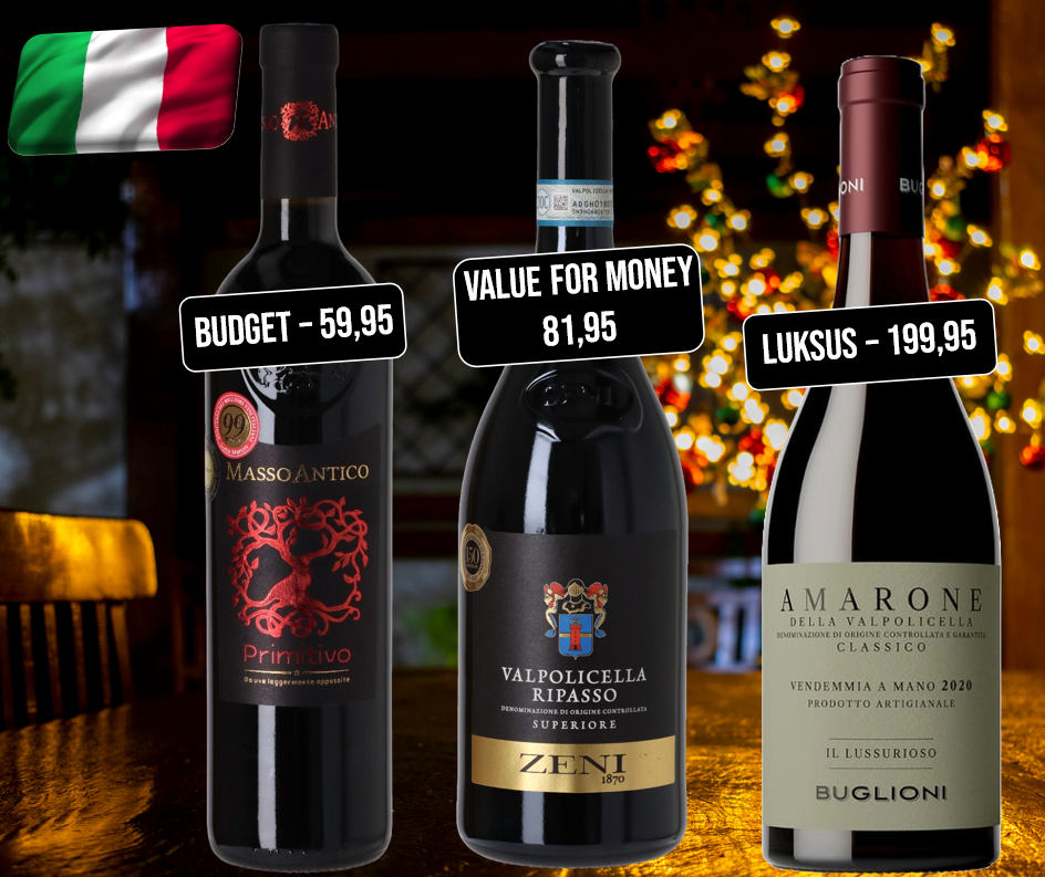 Vi lægger ud med tre topanbefalinger fra støvlelandet, der igennem nyere tid har været danskernes foretrukne land at købe vin fra til juleaften. Det er meget naturligt, da vi her finder mange forskellige vine med den rette grad af bærsødme og fyldighed, der ikke kun matcher den danske julemad, men også mange danske hverdagsretter i al almindelighed.